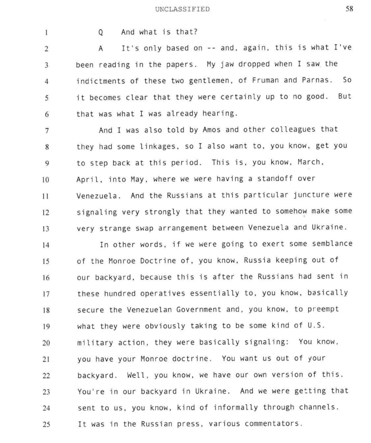 Idén är inte ny. Redan i oktober 2019 vittnade Fiona Hill, tidigare säkerhetsrådgivare i Vita huset, inför kongressen om att Ryssland signalerat ett förslag om att byta Venezuela mot Ukraina. Det var under Trumps första mandatperiod, och Hill kallades som vittne i den riksrättsutredning som handlade om huruvida presidenten pressat Ukrainas Zelenskyj att utreda Joe Biden. Hill varnade för att Ryssland utnyttjade den politiska turbulensen i Washington, och att amerikanska aktörer spelade Kreml i händerna genom att behandla Ukraina som en bricka i ett inrikespolitiskt spel. “Ryssarna signalerade mycket starkt att de ville göra något slags märkligt bytesarrangemang mellan Venezuela och Ukraina”, sa hon. Budskapet från Moskva var tydligt: “Ni har er Monroe-doktrin. Ni vill ha oss borta från er bakgård. Tja, ni vet, vi har vår egen version av detta. Ni är i vår bakgård i Ukraina.” Det som då lät som en bisarr tanke håller nu på att bli verklighet.