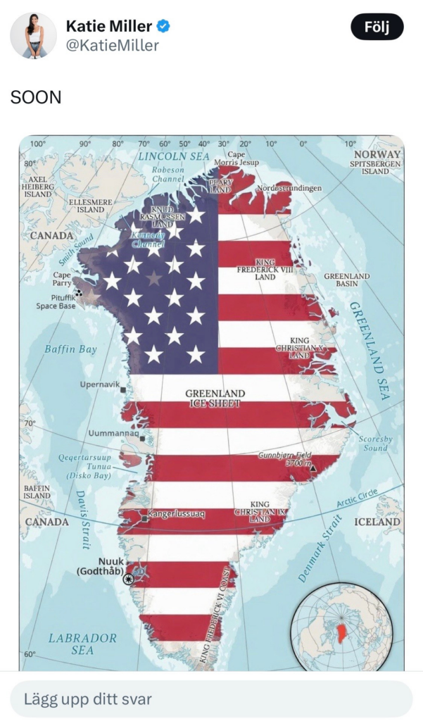 Ett ord. “SOON.” Under bilden syns en karta över Grönland, infärgad med amerikanska flaggan. Det är Katie Miller som postar på X den 3 januari, hon som är gift med Stephen Miller, Vita husets biträdande stabschef. Samma dag genomför USA sin största militära operation i Latinamerika sedan invasionen av Panama 1989 och tillfångatar Venezuelas president Nicolás Maduro. Nyheten om händelsen sprids blixtsnabbt över världen och reaktionerna låter inte vänta på sig. Danmarks ambassadör i Washington svarar inom timmar. “Vi förväntar oss full respekt för Danmarks territoriella integritet.”
