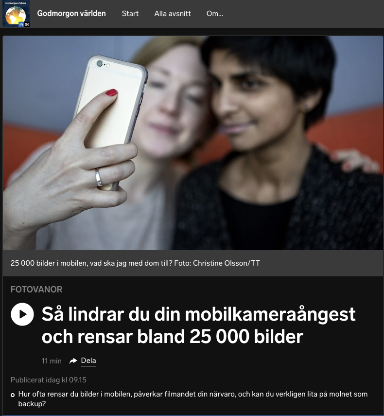 SR P1 (2026). Så lindrar du din mobilkameraångest och rensar bland 25000 bilder. https://www.sverigesradio.se/artikel/sa-lindrar-du-din-mobilkameraangest-och-rensar-bland-25-000-bilder