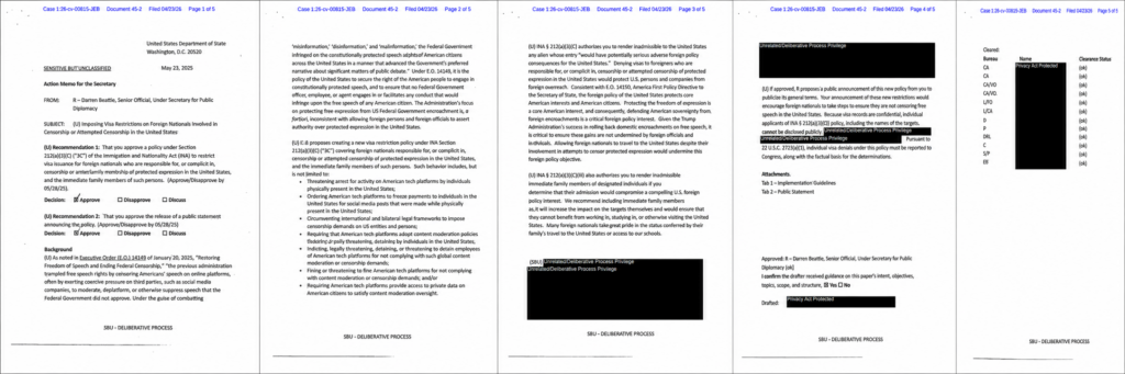 U.S. Department of State, & Beattie, D. (2025, 23 maj). Action memo for the Secretary. Imposing visa restrictions on foreign nationals involved in censorship or attempted censorship in the United States [Document 45-2, Coalition for Independent Technology Research v. Rubio, No. 1:26-cv-00815-JEB].
